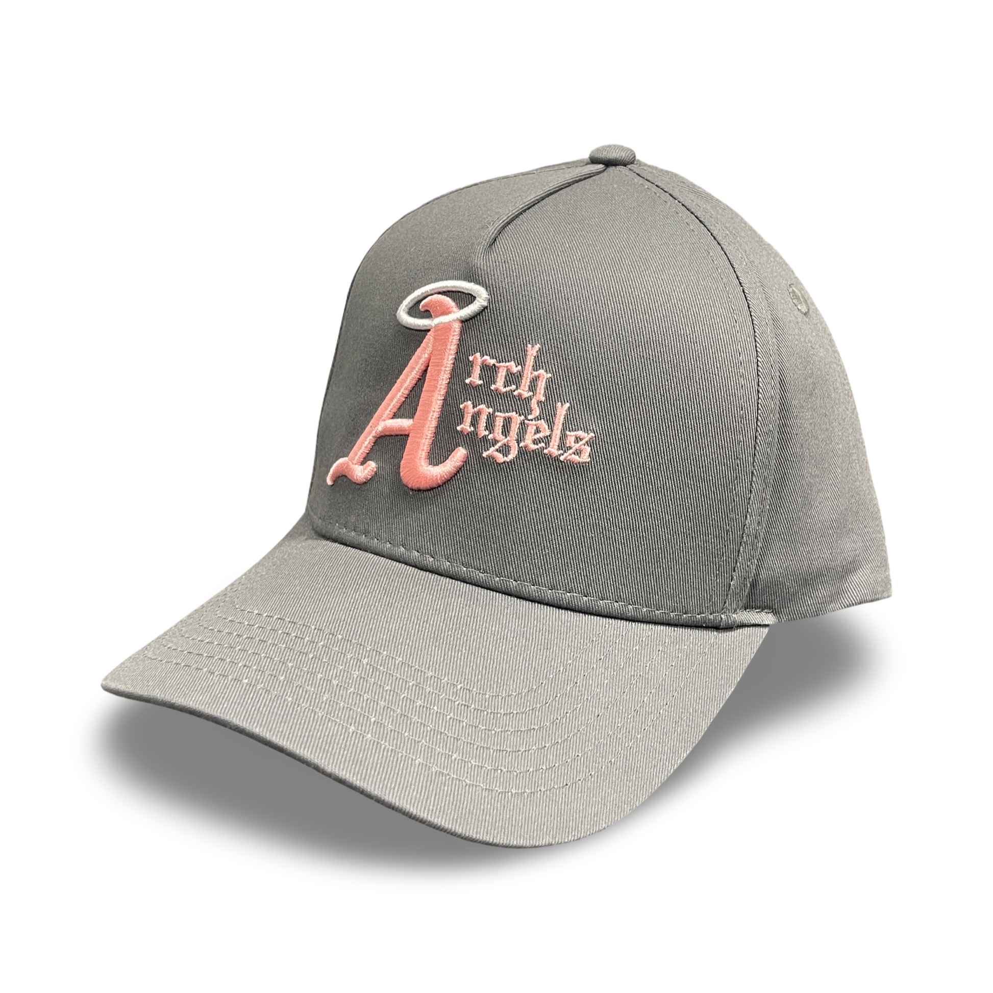 Arch Angels “Halo A” Cap – Grey / Rose features a structured 6-panel design with a grey crown and brim, finished with premium raised rose embroidery. The signature Arch Angels “A” logo with halo delivers a clean, modern streetwear look. Adjustable strap provides a comfortable, everyday