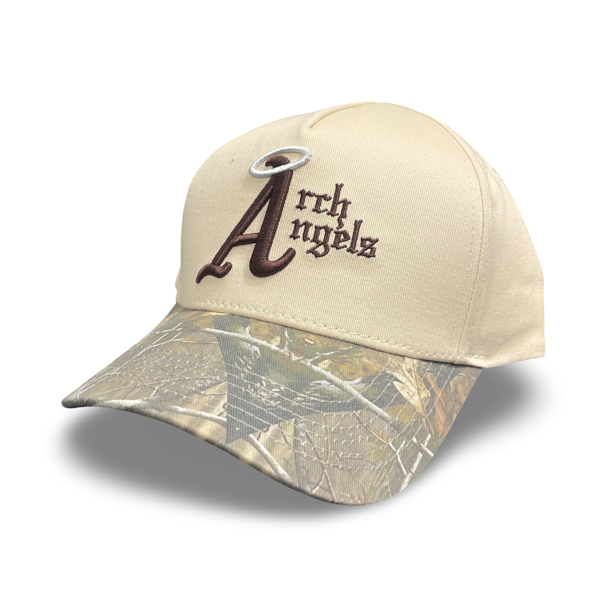 A clean cream crown paired with a camo brim for a bold streetwear look. Features our embroidered Halo “A” logo and Arch Angels script, finished with a curved brim and adjustable strap for all-day comfort.